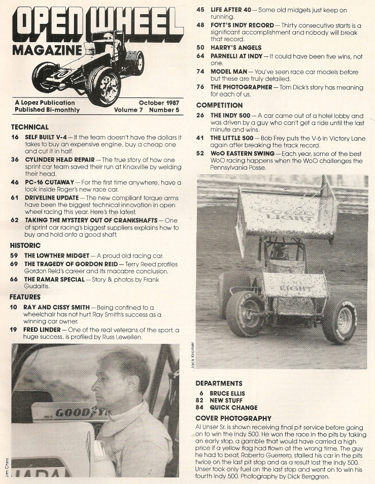 Reviews OPEN WHEEL 1987 OCT - INDY 500, BOB FREY, FRED LINDER, LITTLE 500, GORDON REID