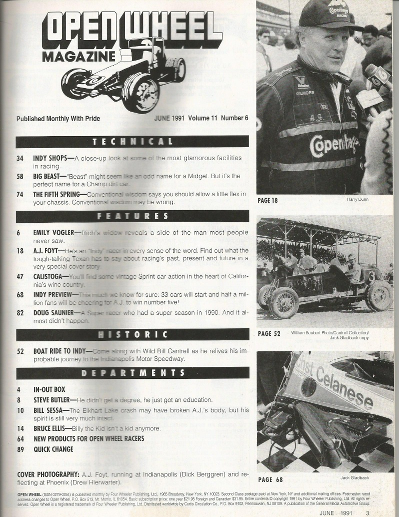 Reviews OPEN WHEEL 1991 JUNE - EMILY VOGLER, AJ FOYT, CALISTOGA, SAUNIER, CANTRELL