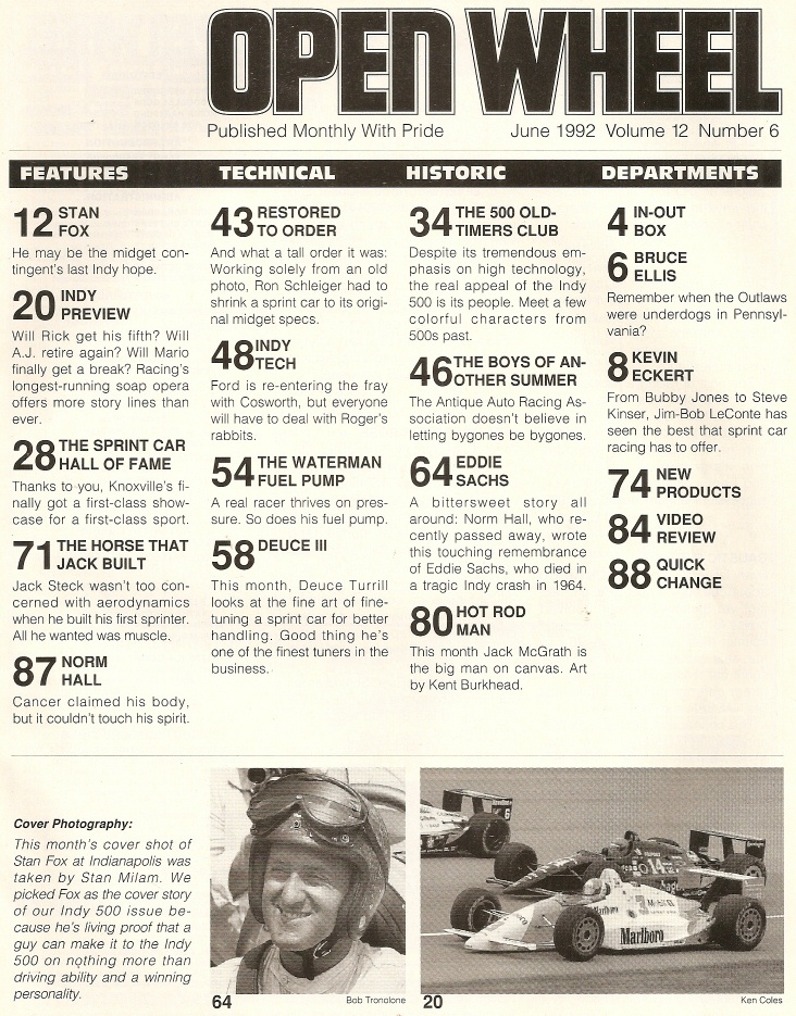 Reviews OPEN WHEEL 1992 JUNE - STAN FOX, INDY PREVIEW, EDDIE SACKS TRIBUTE, J STECK