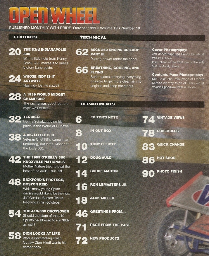 Reviews OPEN WHEEL 1999 OCT - DONNY SCHATZ, CHET FILLIP, DION HINDI, INDY 500 & FOYT