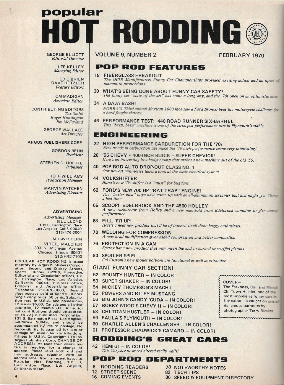 POPULAR HOT RODDING 1970 FEB - FORD 494ci MONSTER, FUNNY CARS, 440 ROAD RUNNER