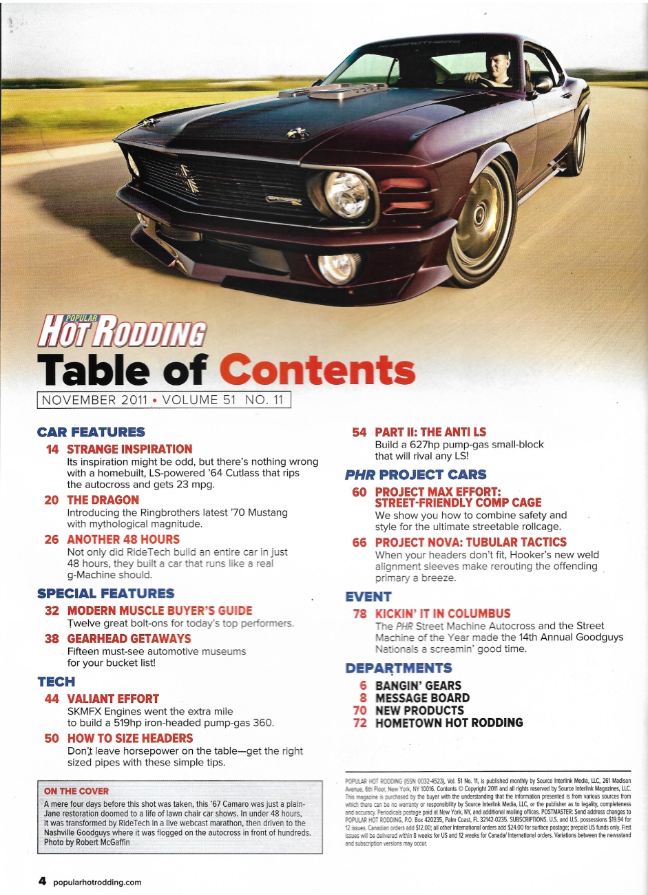 Reviews POPULAR HOT RODDING 2011 NOV - HEADER Spcl, RING BROTHERS '70 MUSTANG, MOPAR 360