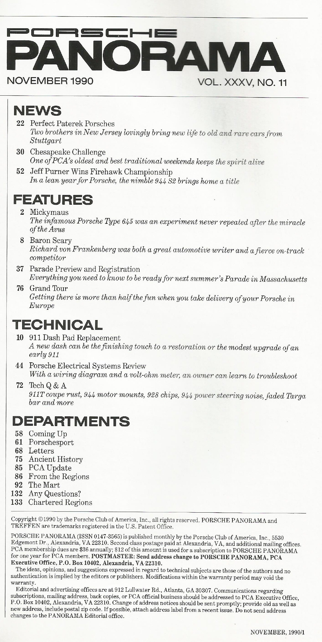 Reviews PORSCHE PANORAMA 1990 NOV - TYPE 645, JEFF PURNER, PORSCHE ELECTRICAL SYSTEMS