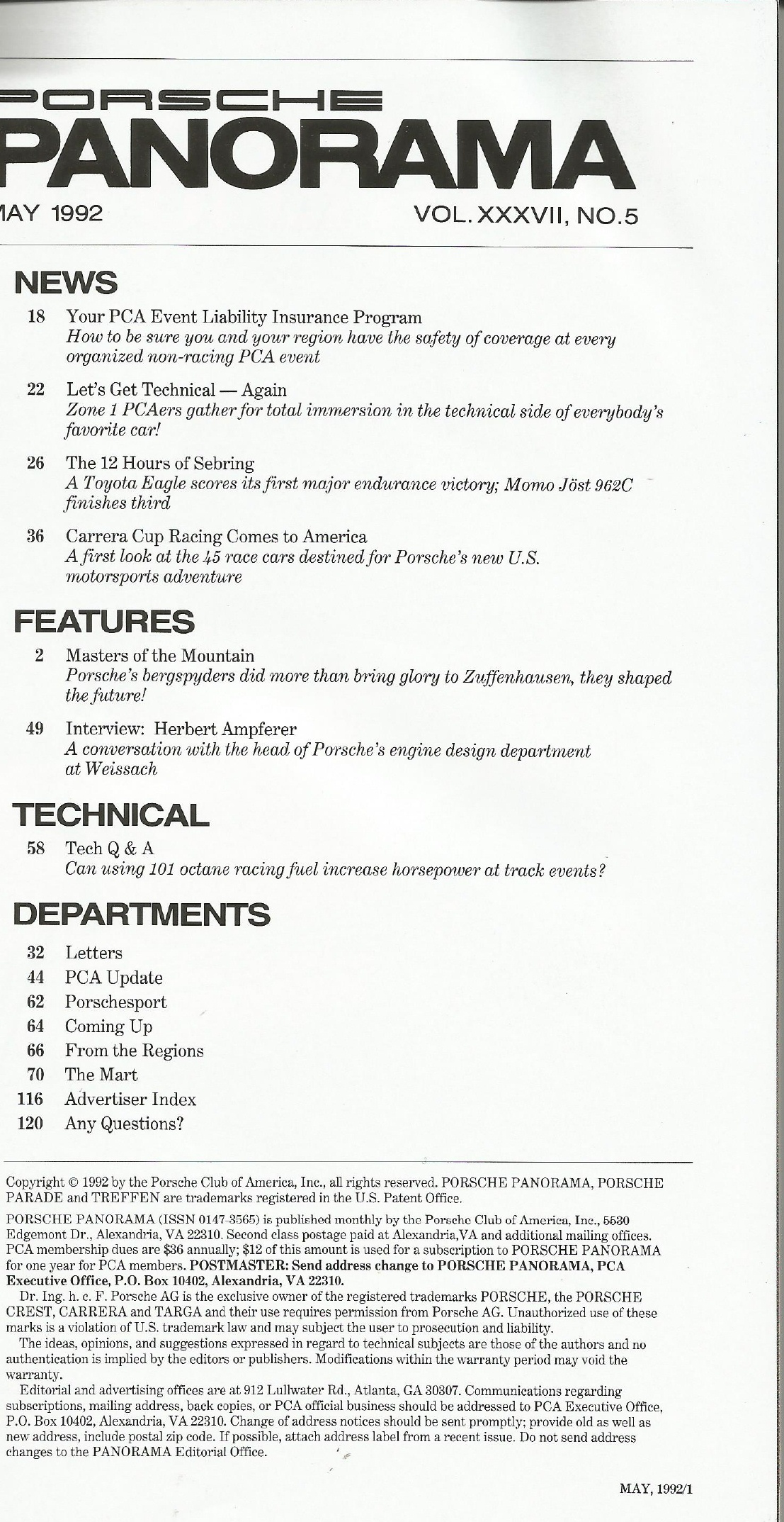 Reviews PORSCHE PANORAMA 1992 MAY - 909 & 910 SPYDERS, SEBRING 12-hr, AMPFERER