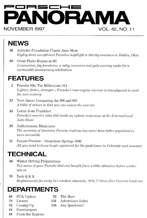 Reviews PORSCHE PANORAMA 1997 NOV - ADMIRING & ANALYSING THE NEW 996, WINTER DRIVING