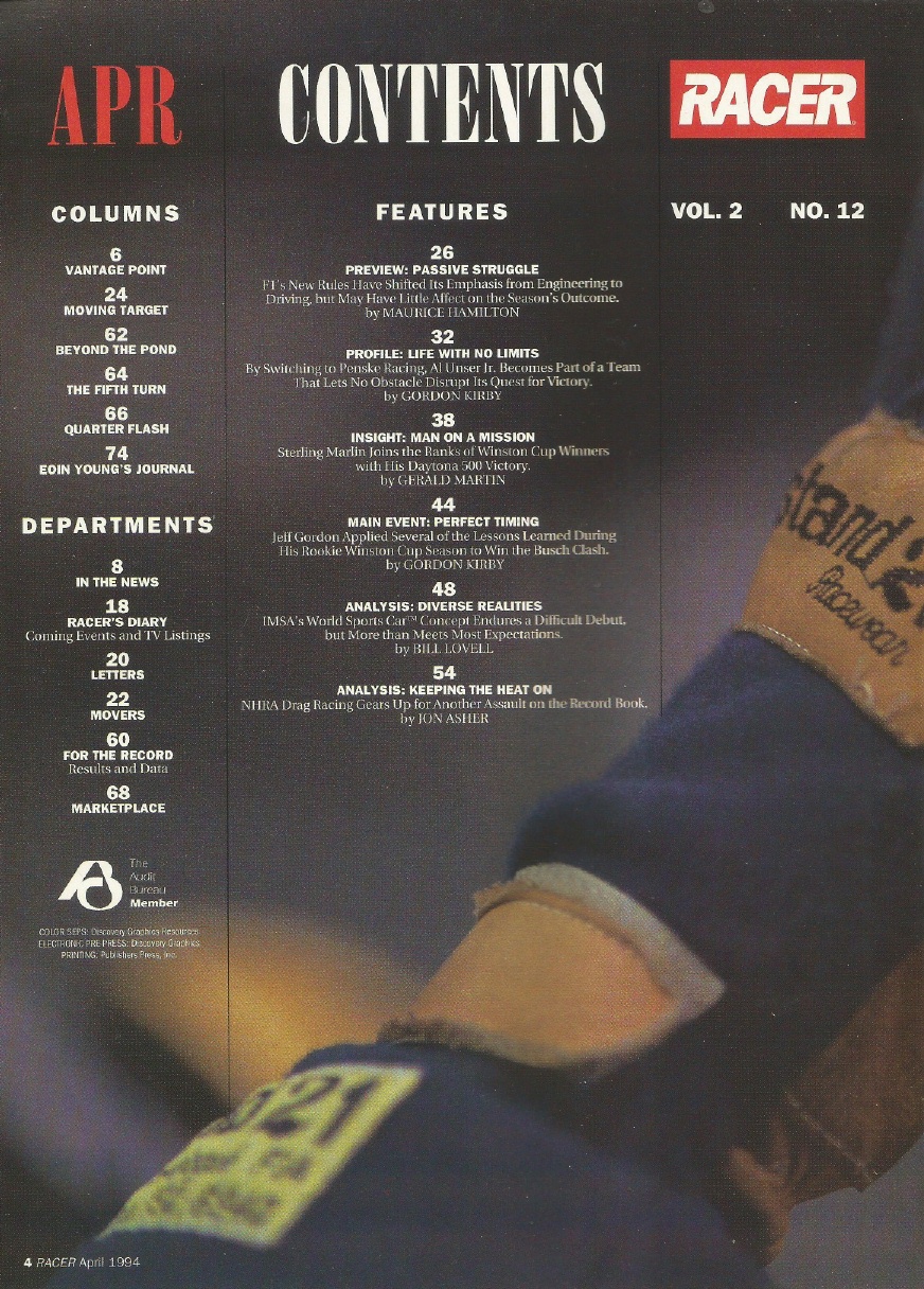 Reviews RACER MAGAZINE 1994 APR - UNSER, STERLING & GORDON WIN BIG, NHRA ALL SET