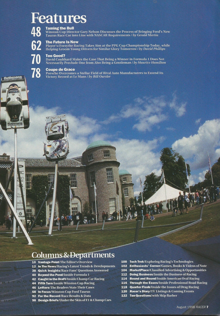 Reviews RACER MAGAZINE 1998 AUG - COULTHARD, LeMANS, SKIP BARBER, WINSTON CUP TAURUS
