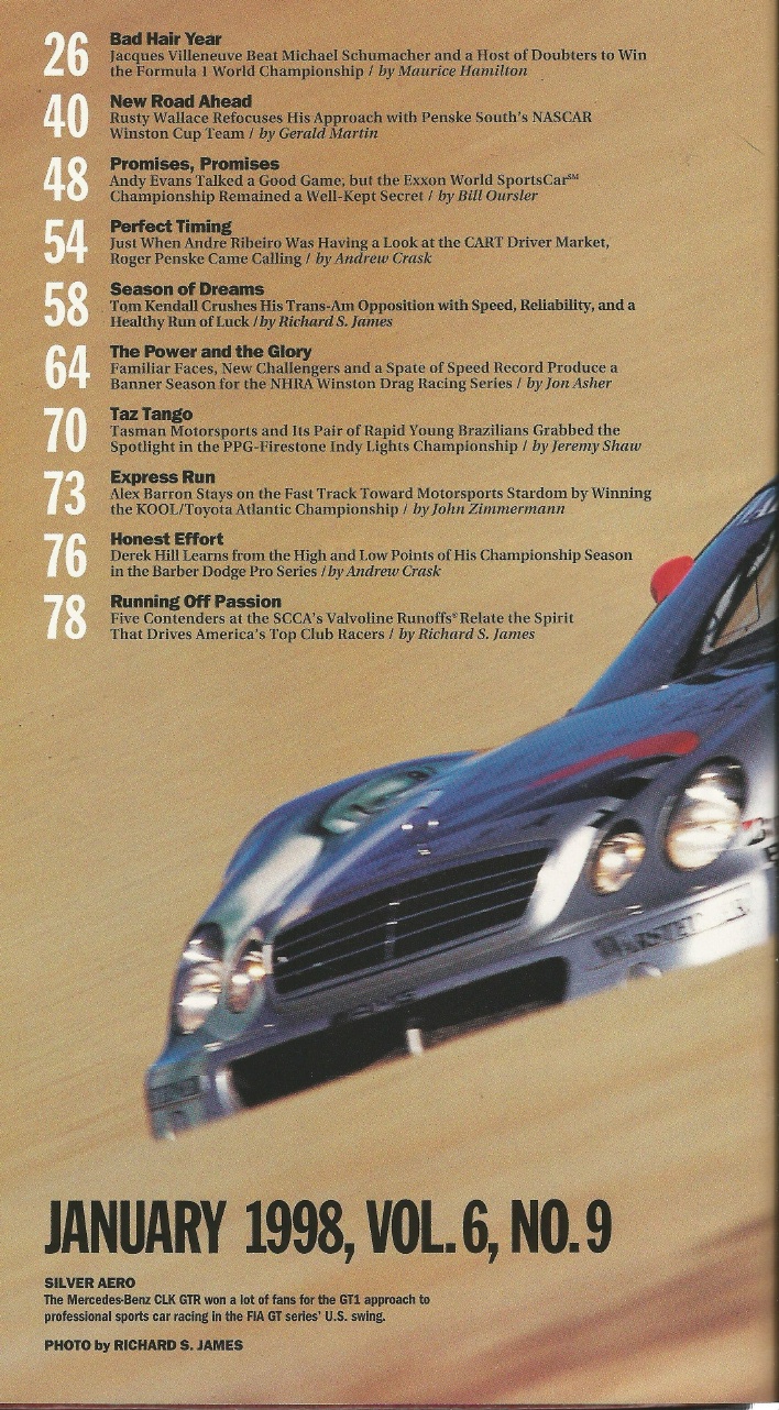 Reviews RACER MAGAZINE 1998 JAN - KENDALL T-A, McLAREN MP4/12, RUSTY, BARRON, TASMAN