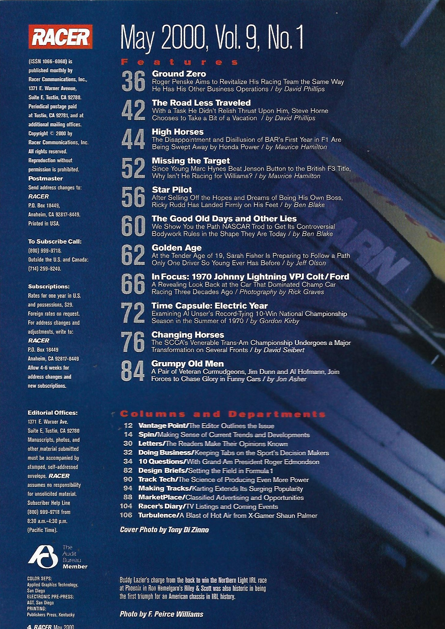 Reviews RACER MAGAZINE 2000 MAY - PALMER, GANASSI, PENSKE, RICKY RUDD, JOHNNY LIGHTNING