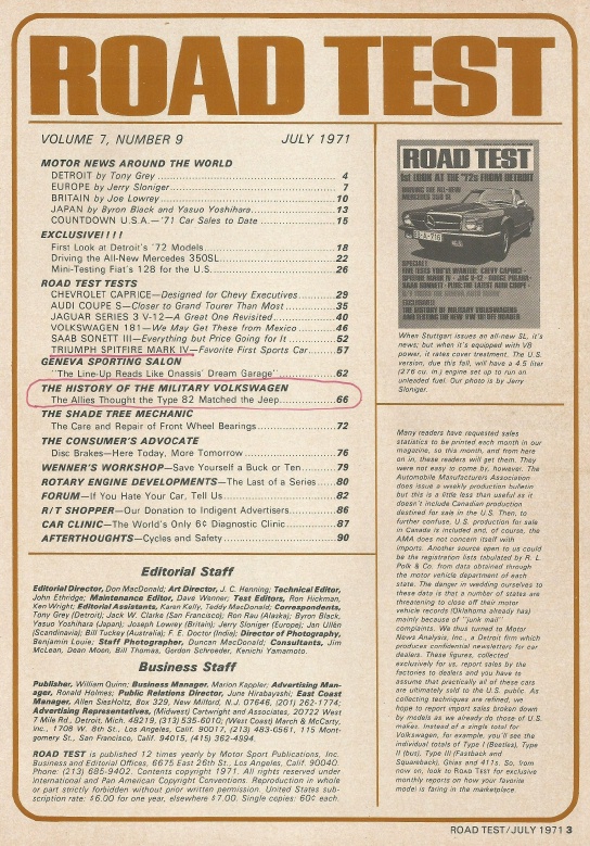 Reviews ROAD TEST MAGAZINE 1971 JULY - SONETT, V12 JAG, MILITARY VWs, AUDI COUPE S