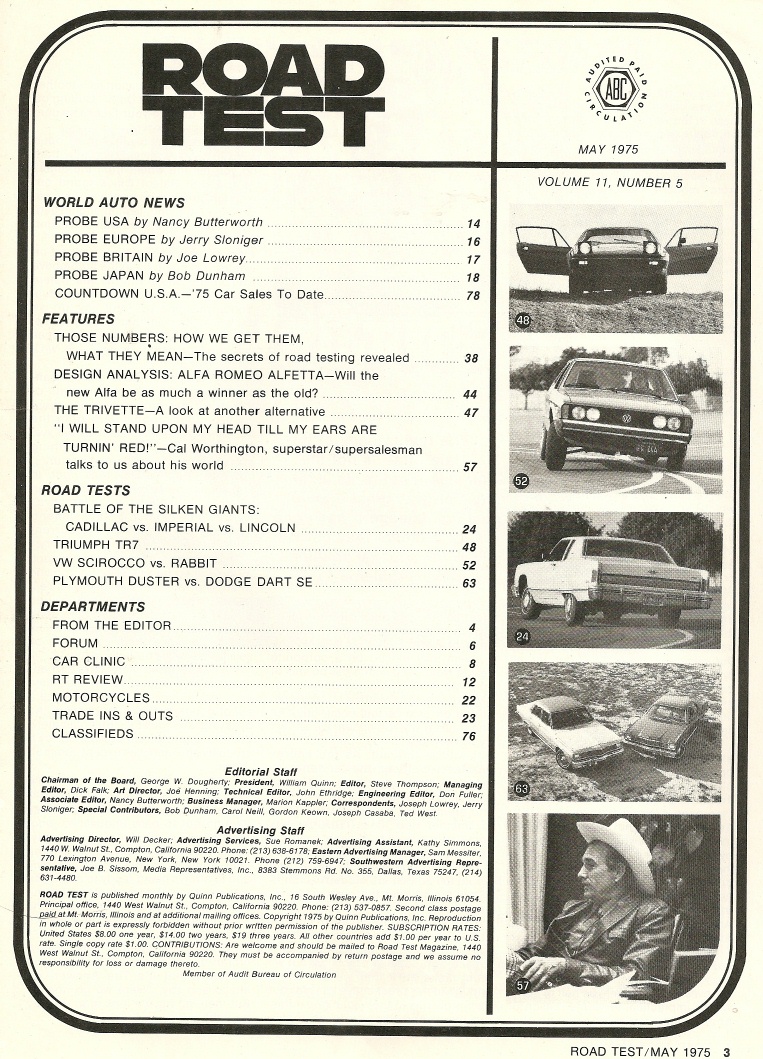 Reviews ROAD TEST MAGAZINE 1975 MAY - DE VILLE v IMPERIAL Le BARON v CONTINENTAL, TR7