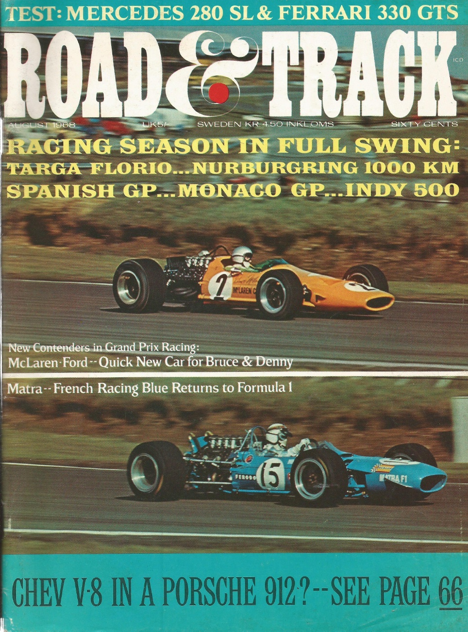 Reviews ROAD & TRACK 1968 AUG - V-8 PORSCHE 912, GRANDS PRIX