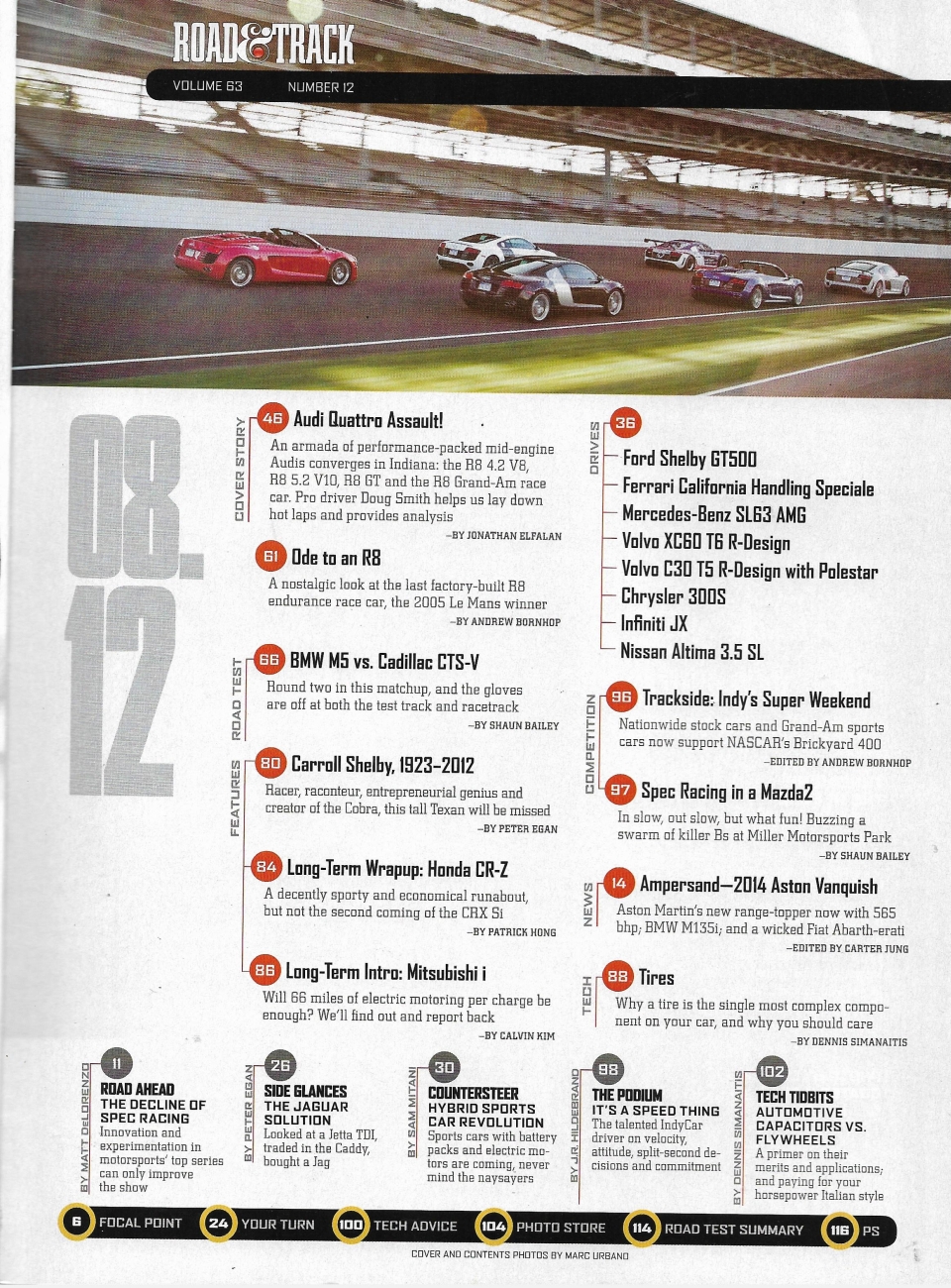 Reviews ROAD & TRACK 2012 AUG - GT vs GRAND-AM, AUDI R-8, VANQUISH, BMW M5 vs CTS-V
