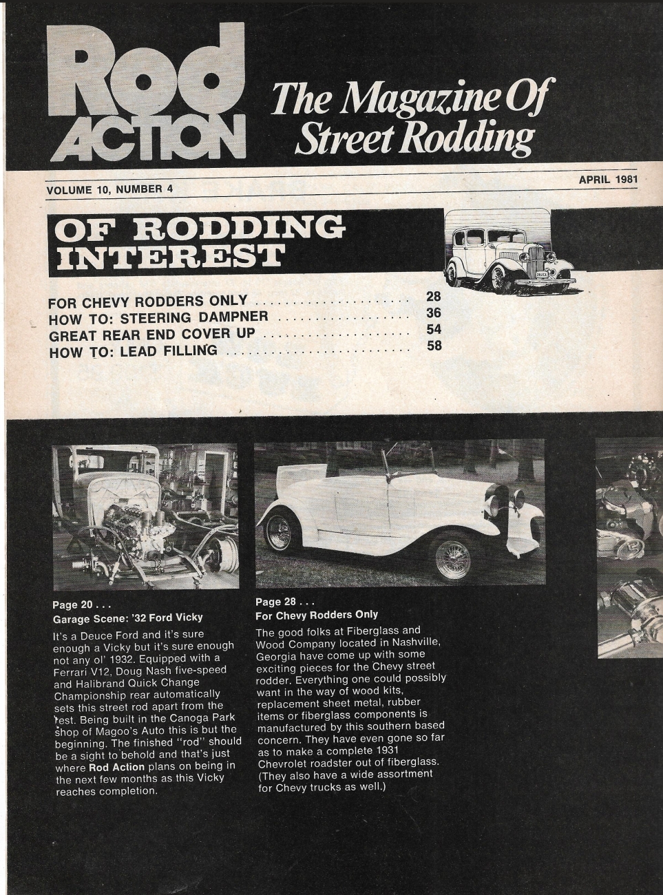 Reviews ROD ACTION 1981 APR - FERRARI POWERED '32 VICKY, CHEVY GLASS & WOOD