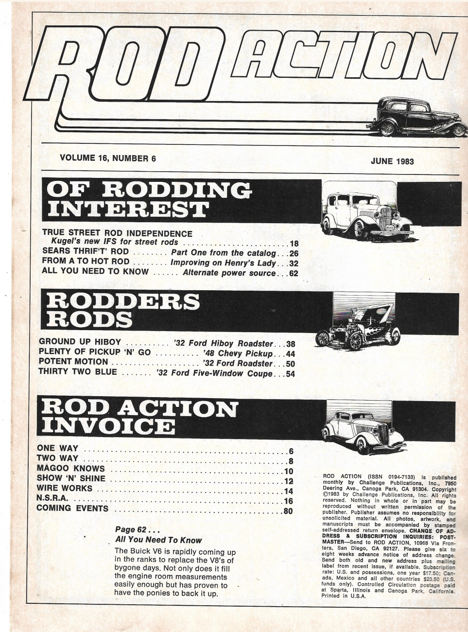 Reviews ROD ACTION 1983 JUNE - BUICK V-6, '32 HIGH BOY, '48 CHEVY PICKUP, '32 ROADSTER