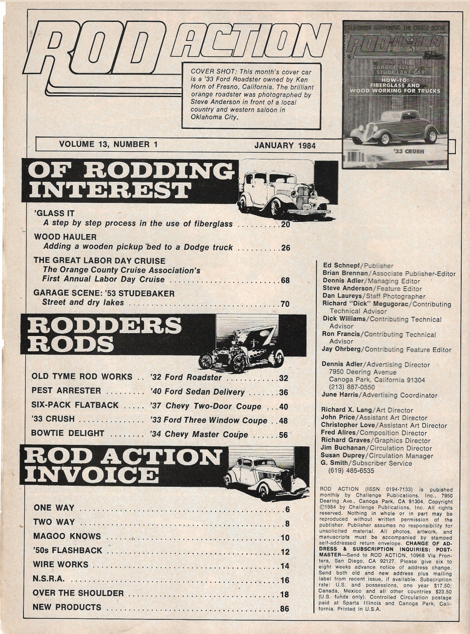 Reviews ROD ACTION 1984 JAN - '53 STUDE LAKE CAR,FIBERGLASS & WOOD TRUCKS, '33 CRUSH