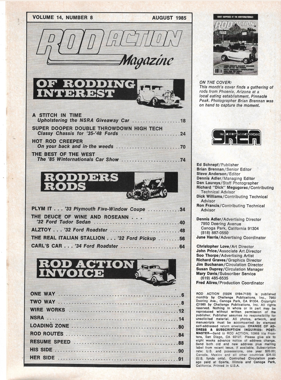 Reviews ROD ACTION 1985 AUG - UPHOLSTERY, '33 PLYMOUTH 5 WIN, '32 FORD PU, '34 ROADSTER
