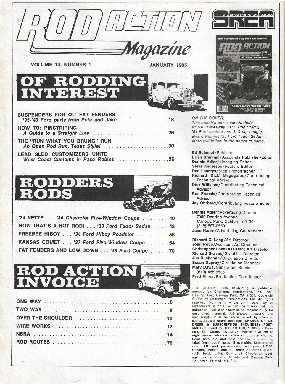 Reviews ROD ACTION 1985 JAN - PINSTRIPING, '33 FORD TUDOR, '34 CHEV 5 WINDOW VETTE