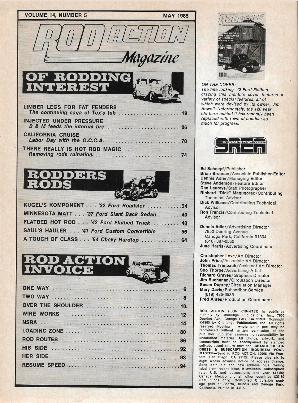 Reviews ROD ACTION 1985 MAY - INJECTION FUEL, '37 SLANT BACK, '42 FLATBED, '54 CHEVY
