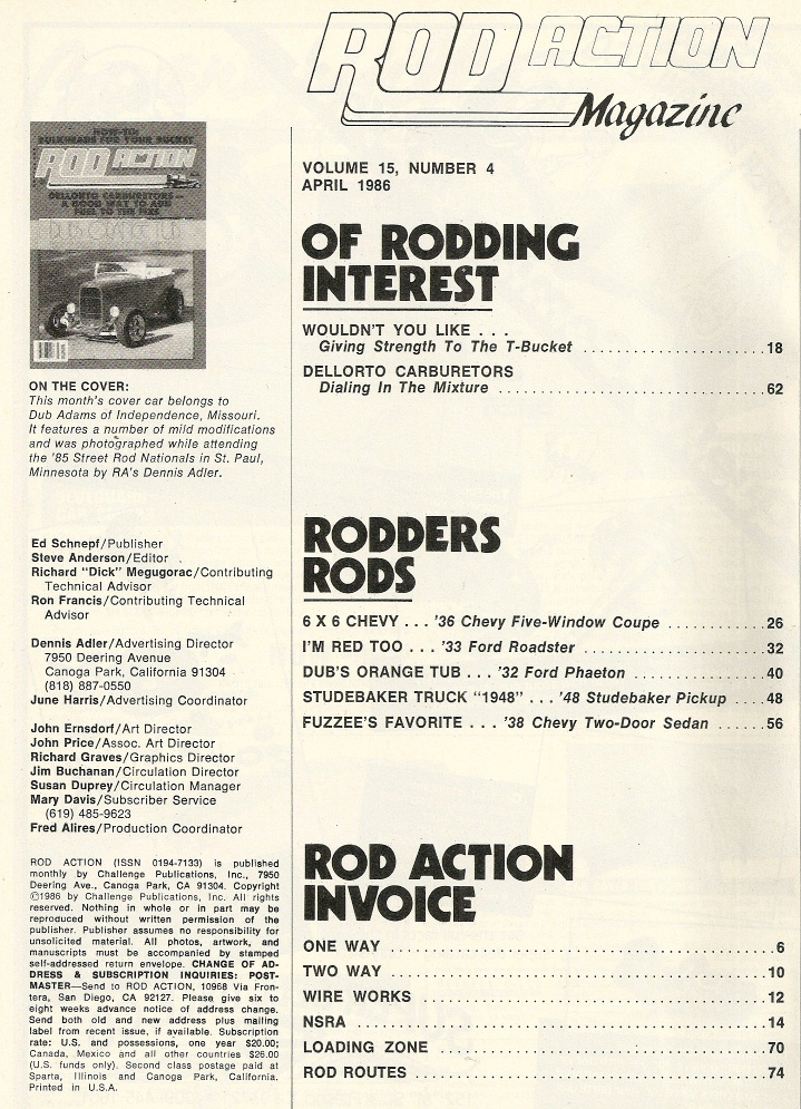 Reviews ROD ACTION 1986 APR - DELLORTO CARBS, BUCKET BULKHEADS, 48 STUDEBAKER TRUCK