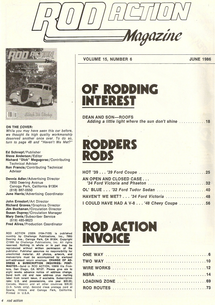 Reviews ROD ACTION 1986 JUNE - SUNROOFS FOR VICKYS & SEDANS, '48 CHEVY COUPE
