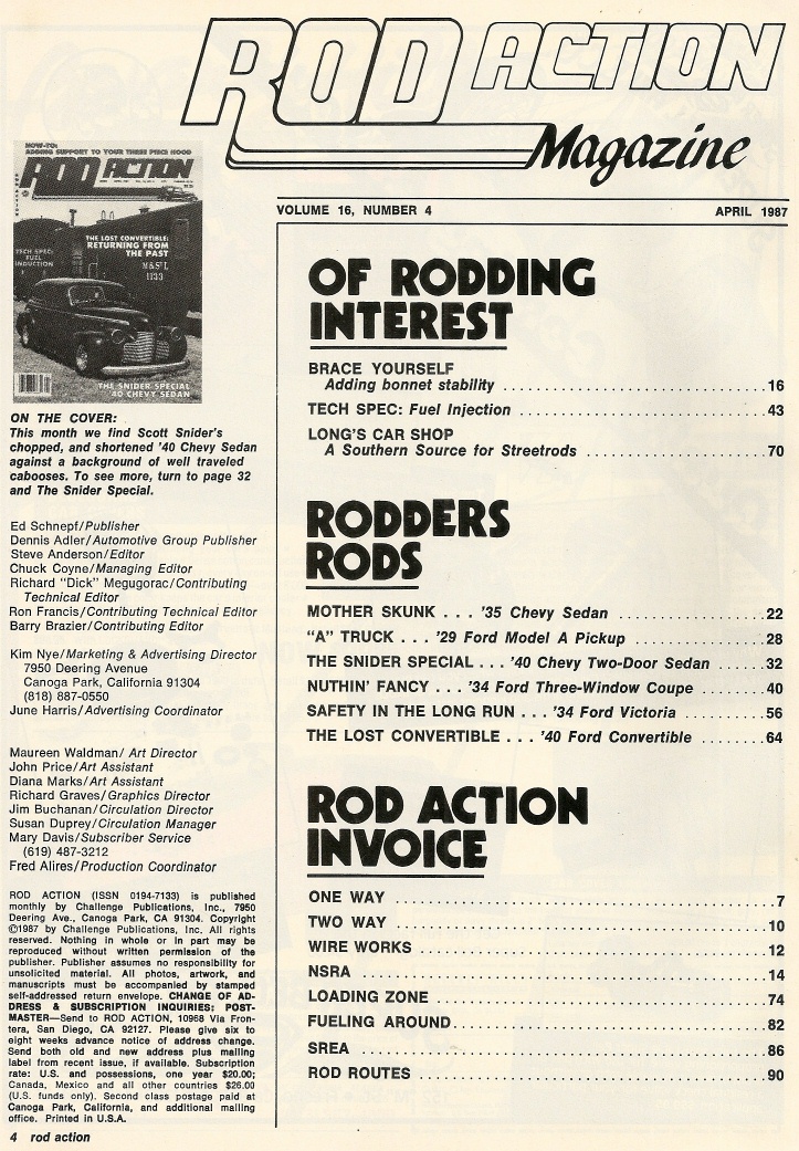 Reviews ROD ACTION 1987 APR - 3-PIECE HOOD FRAME, NUTHIN FANCY, 1st 40 FORD DROPTOP