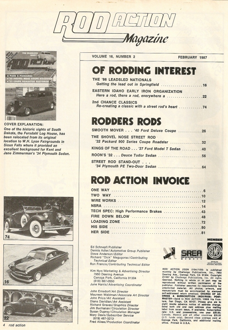 Reviews ROD ACTION 1987 FEB - LEADSLED NATS, 32 PACKARD ROD, PERFORMANCE BRAKES