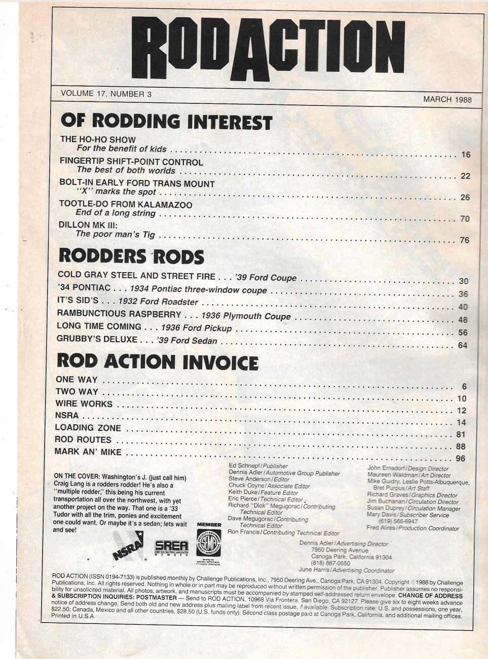 Reviews ROD ACTION 1988 MAR - '39 FORD COUPE, '34 3-WINDOW COUPE, '36 FORD PU, '36 PLYM
