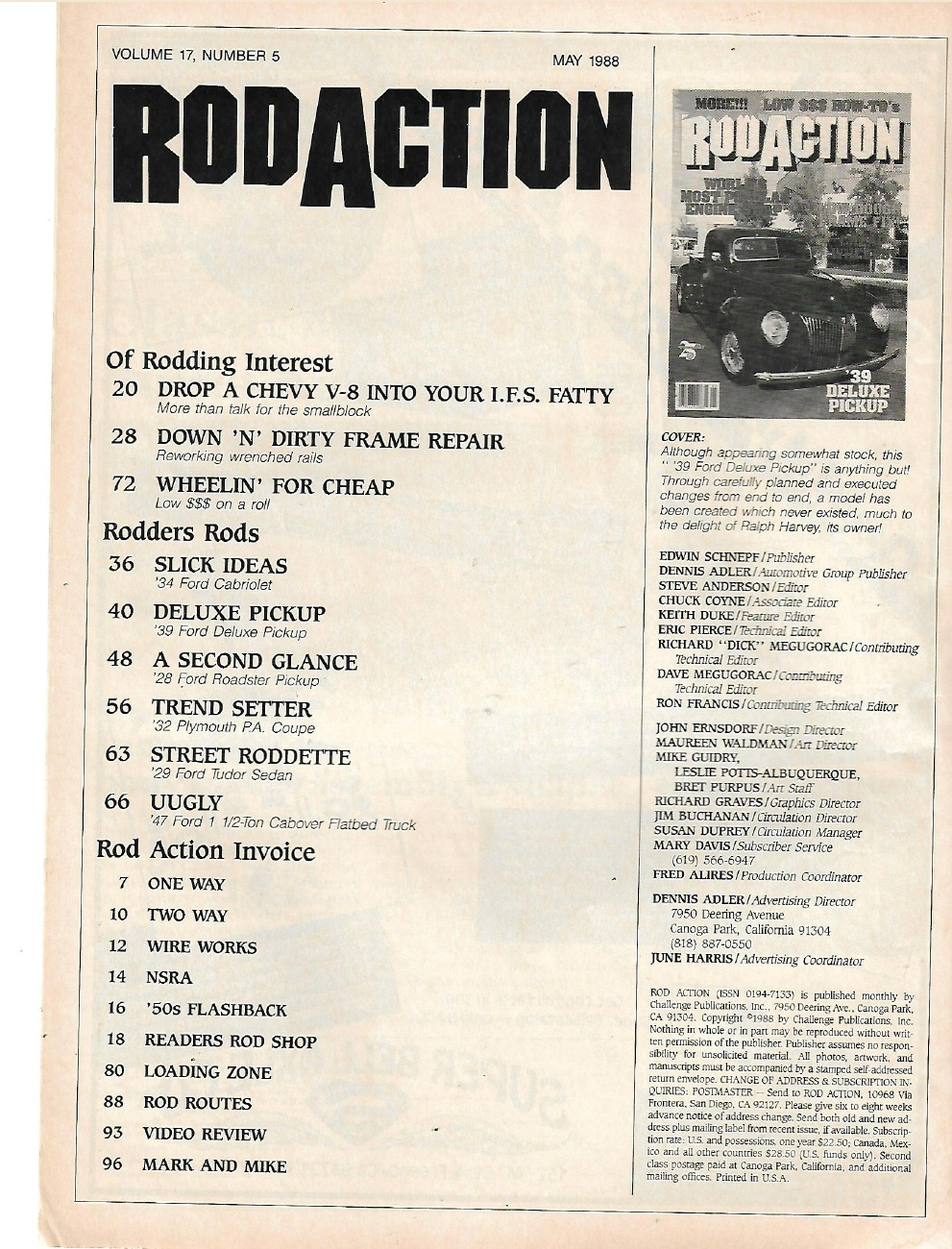 Reviews ROD ACTION 1988 MAY - '39 DELUXE PICKUP, FRAME FIX CHEAP, '34 FORD CABRIOLET