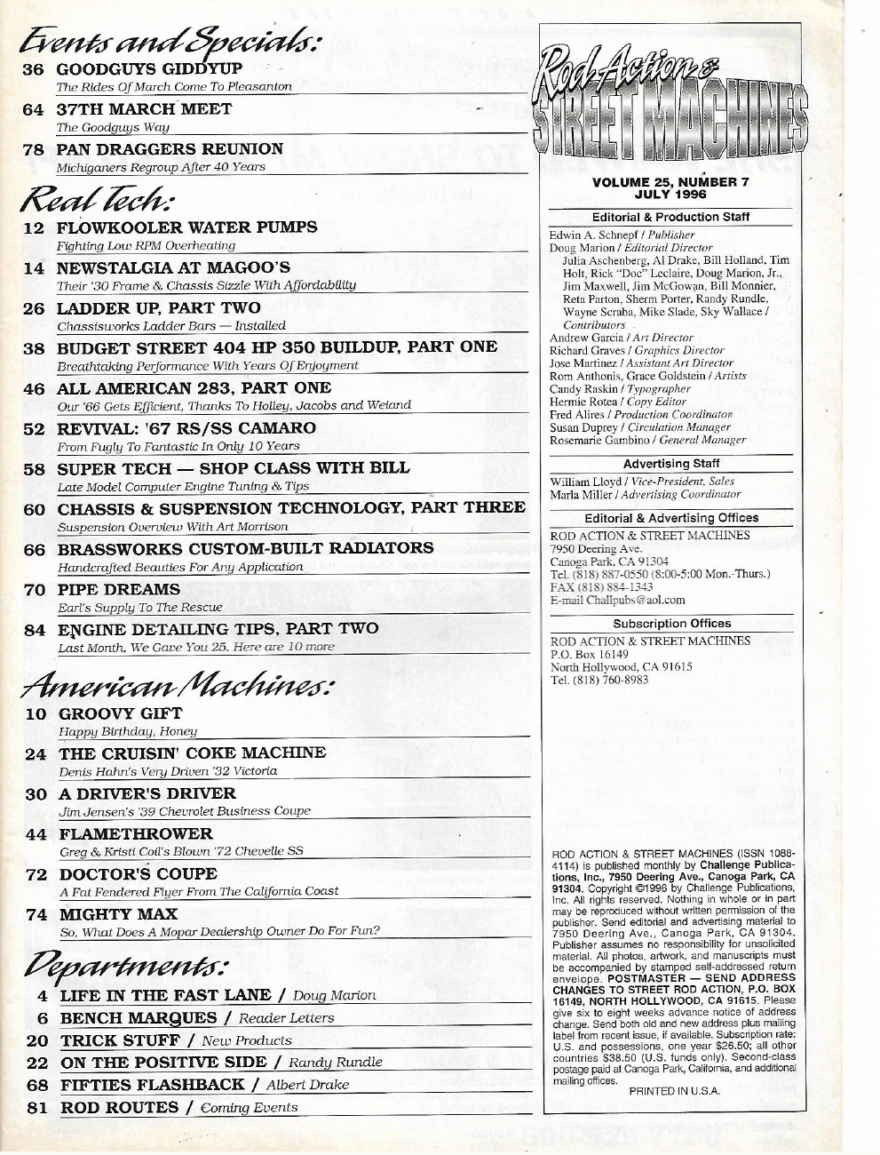 Reviews ROD ACTION & STREET MACHINES 1996 JULY - '66 283 TO 90'S, '67 RS/SS CAMARO