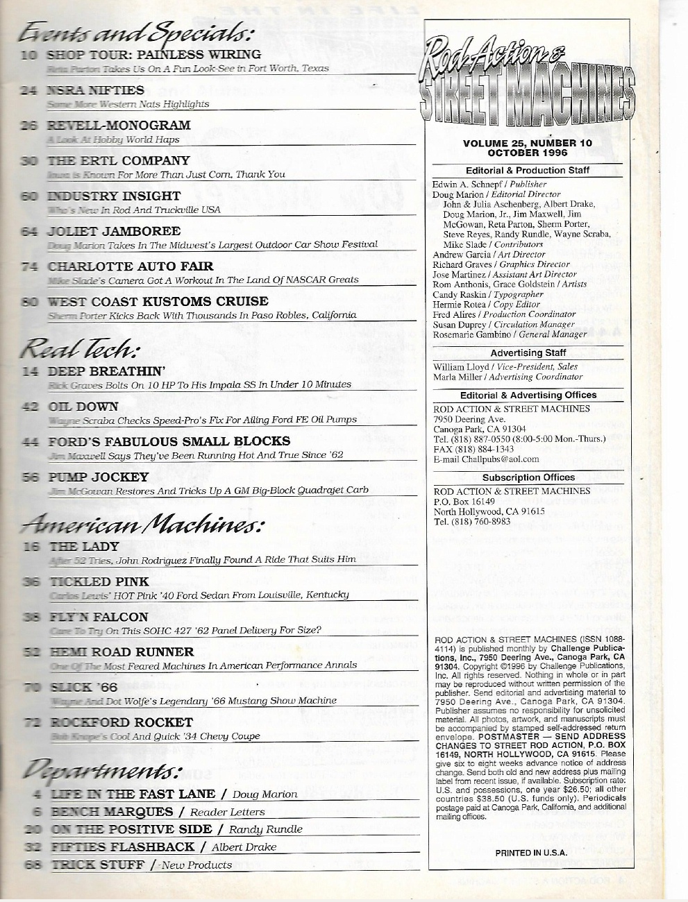 ROD ACTION & STREET MACHINES 1996 OCT - FORD FE OIL PUMP FIX, QUADRAJET, NSRA*