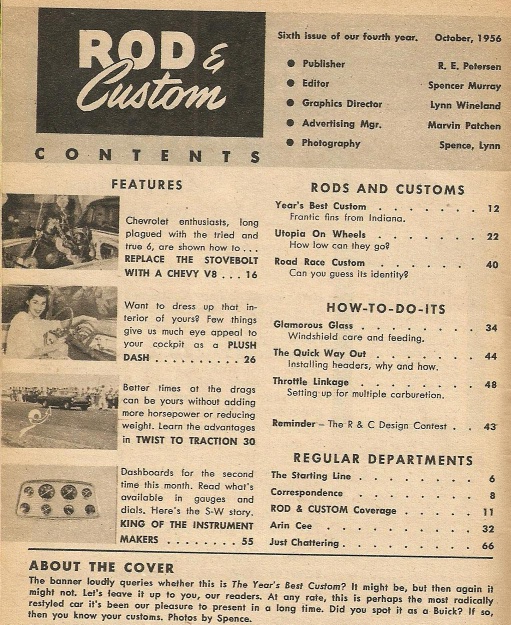 ROD & CUSTOM 1956 OCT -This is a small issue that measures 5 1/4" X 8 ". There is no description for this magazine yet. See picture of cover and contents below for details. ![]() ![]() |