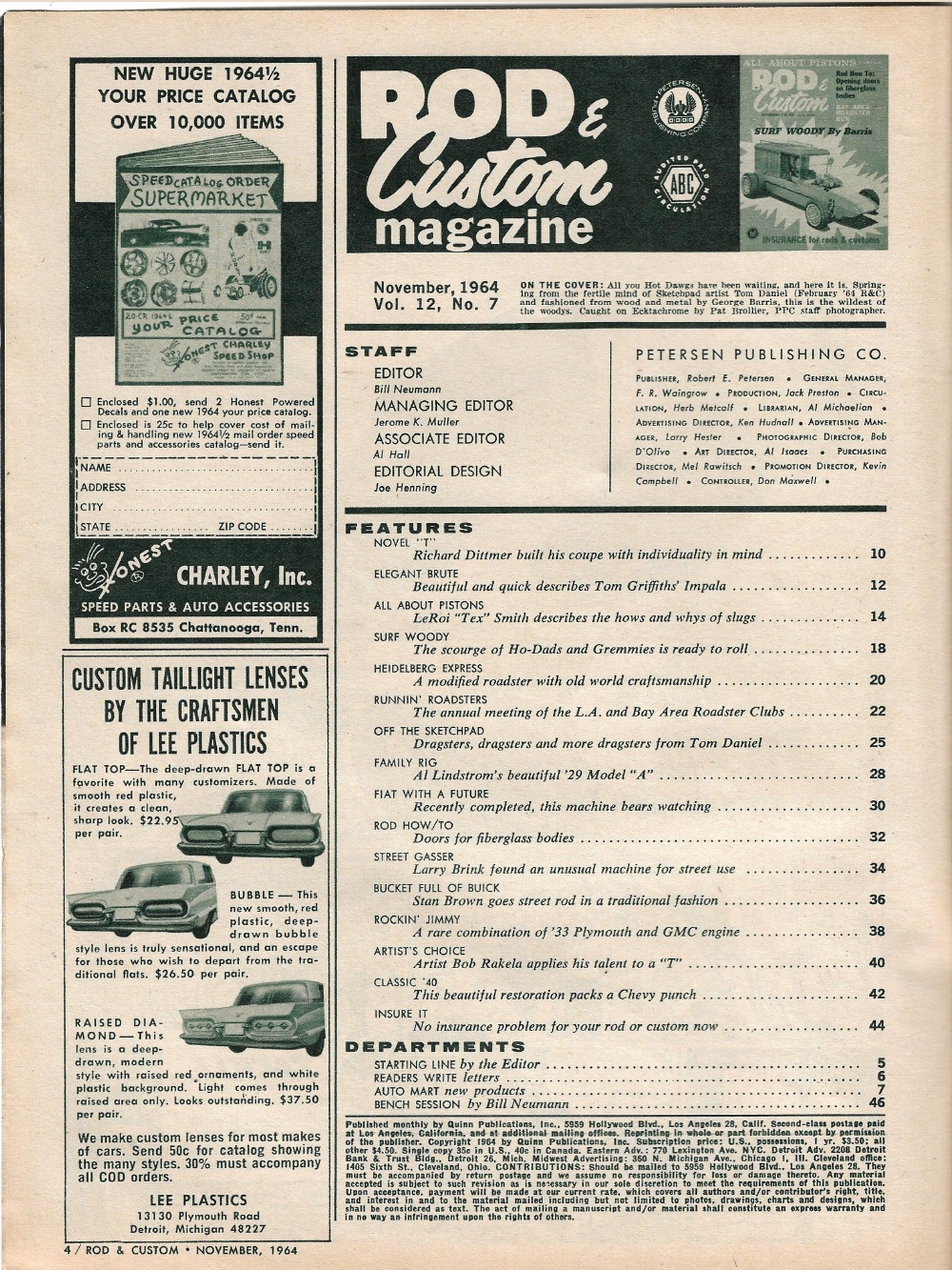 Reviews ROD & CUSTOM 1964 NOV - PISTONS, SURF WOODY BY BARRIS, '33 PLYMOUTH, IMPALA
