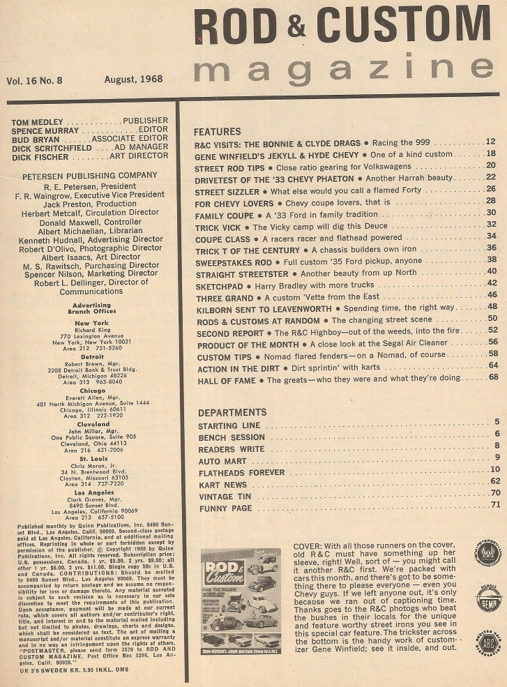Reviews ROD & CUSTOM 1968 AUG - TRI-5 FLARES, AMTs JEKYLL&HYDE, 33 CHEVY PHAETON TEST