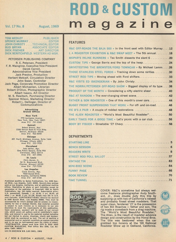 Reviews ROD & CUSTOM 1969 AUG - MOPAR SLANT-6 POWER, HIMSL's ALIEN ROADSTER, ISKY
