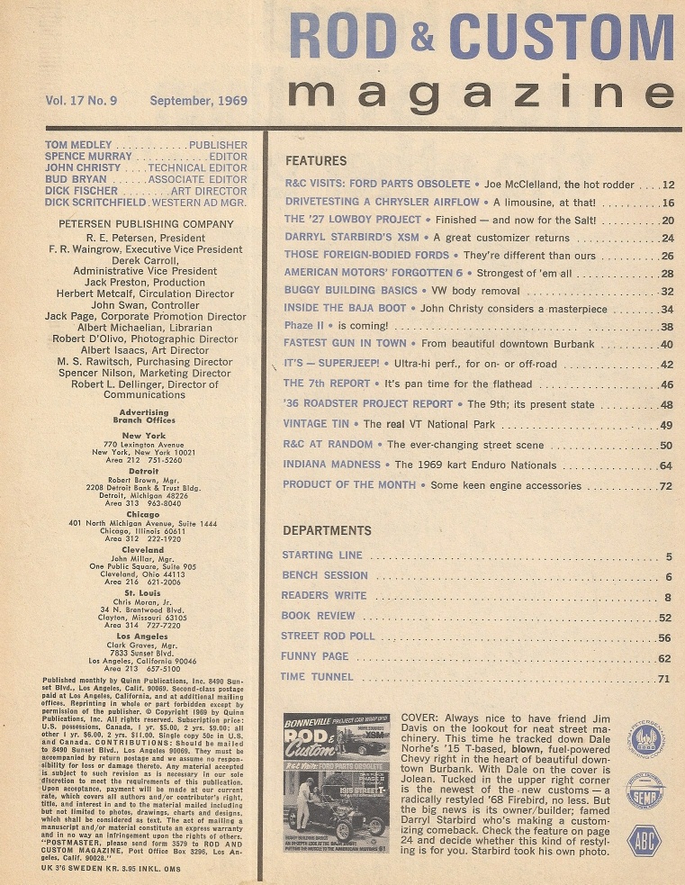 Reviews ROD & CUSTOM 1969 SEPT - STARBIRDs XSM, BUGGY BUILD BASICS, '36 AIRFLOW TEST