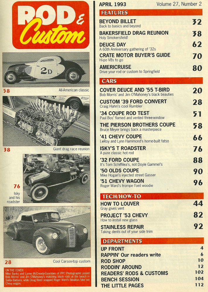 Reviews ROD & CUSTOM 1993 APR - PIERSON Bros COUPE, ISKY T ROADSTER, BAKERSFIELD