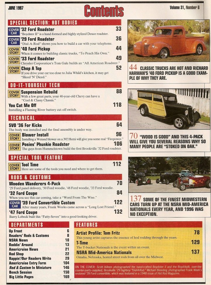 Reviews ROD & CUSTOM 1997 JUNE - TOM FRITZ, CHOP A 1938 FORD SEDAN, BLOWER INSTALLED