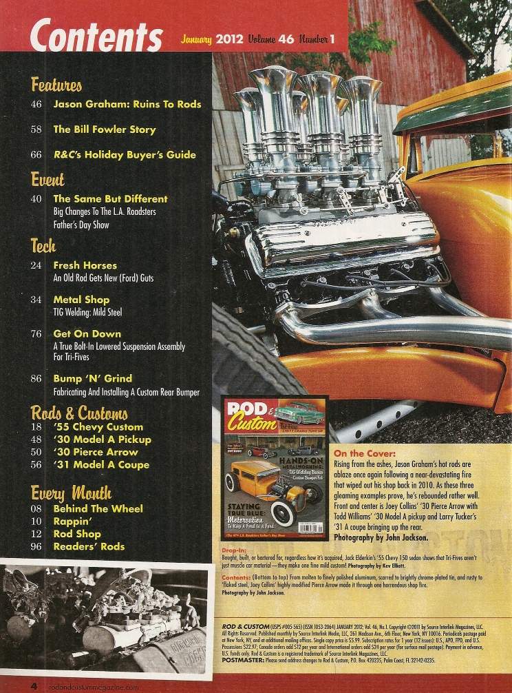 Reviews ROD & CUSTOM 2012 JAN - JASON GRAHAM, BILL FOWLER, DROP A TRI-5 CHEVY, TIG