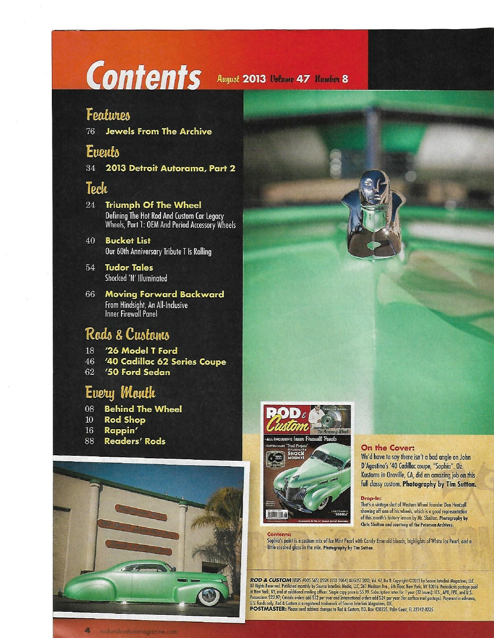 ROD & CUSTOM 2013 AUG - ACCESSORY WHEEL HISTORY, SOPHIA, HEADLIGHT/SHOCK MOUNTS