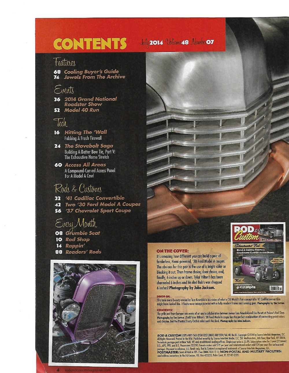 Reviews ROD & CUSTOM 2014 JULY - CUSTOM FIREWALL, 41 CADDY DROPTOP, TWIN EXHAUST 4 A 6