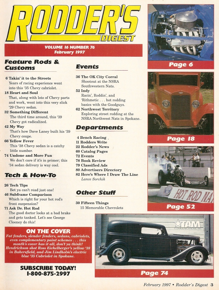 Reviews RODDER'S DIGEST 1997 FEB - SUBFRAMES FOR RODS, GOODGUYS AT INDY, CHEVYS
