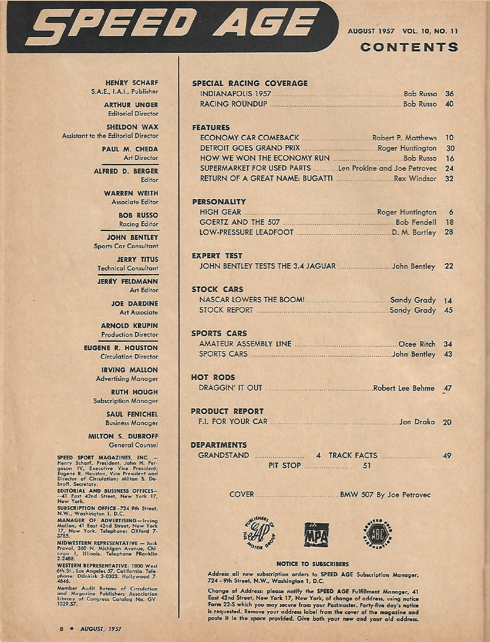 SPEED AGE 1957 AUG - BOB RUSSO - MOBILEGAS, GOERTZ BMW 507,INDY '57, 3.4 JAGUAR*