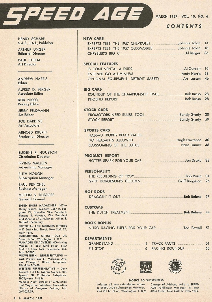 Reviews SPEED AGE 1957 MAR - CHRYSLER 300,GRIFF BORGESON,TEST: '57 CHEVROLET, '57 OLDS*