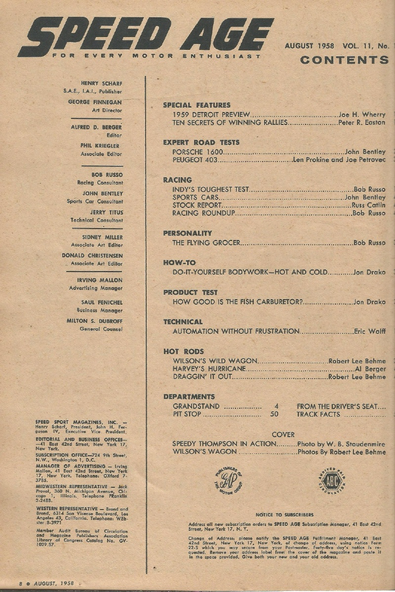 Reviews SPEED AGE 1958 AUG - NEW US CARS, PORSCHE 356A 1600 TEST, PEUGEOT 403