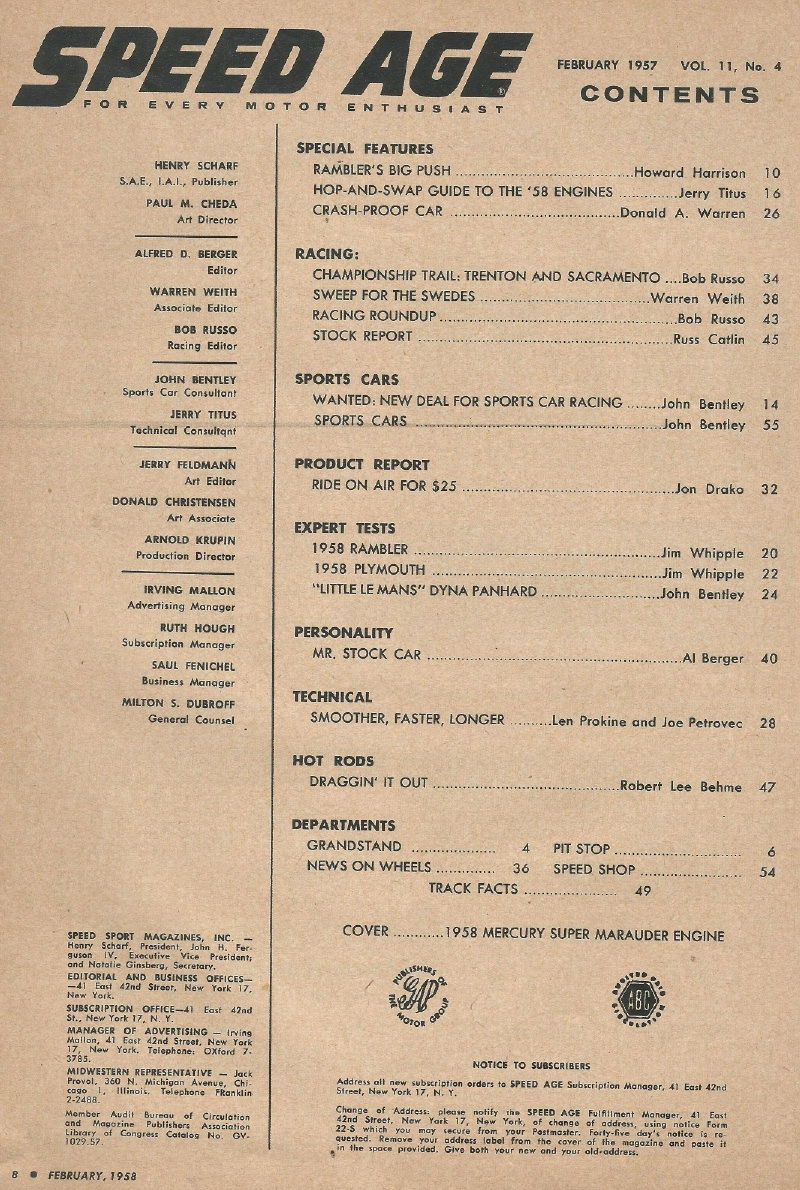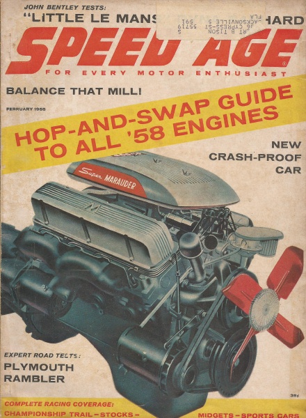 Reviews SPEED AGE 1958 FEB - BILL FRANCE, NEW RAMBLERS, PLYMOUTH & ENGINES*
