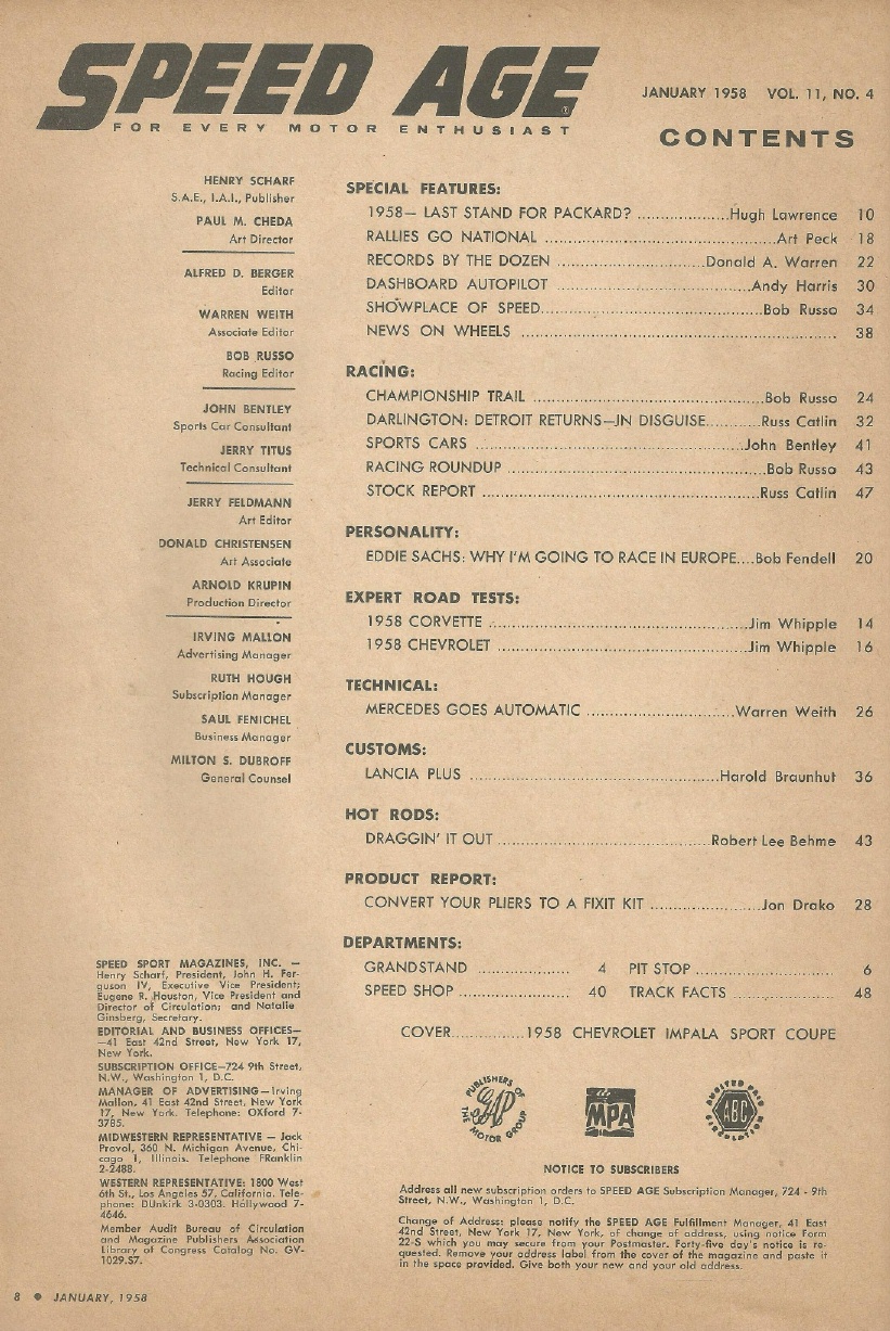 Reviews SPEED AGE 1958 JAN - NEW CHEVY, VETTE & M-B, PACKARD, EDDIE SACHS*