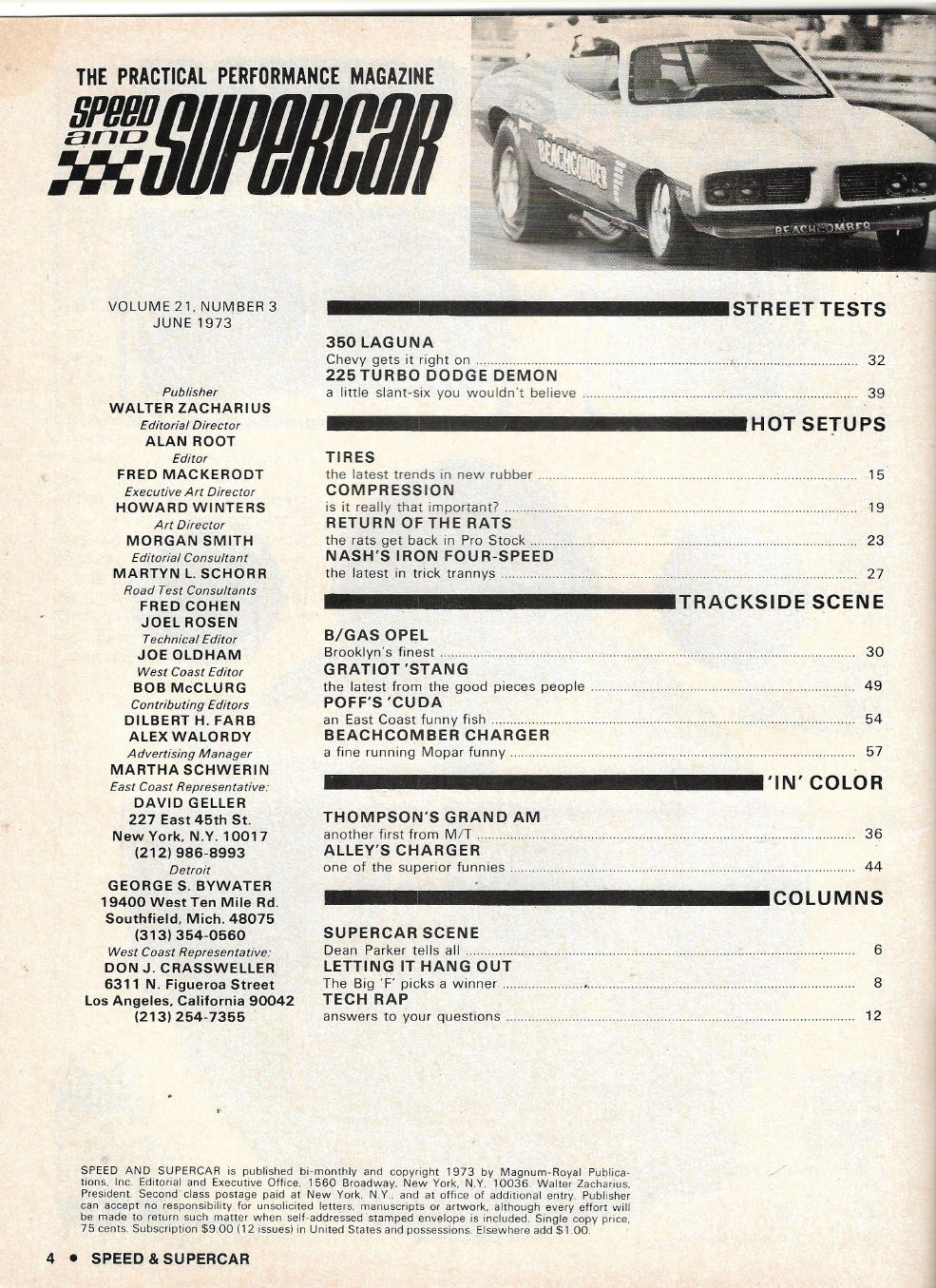 SPEED & SUPERCAR 1973 JUNE - CALIF CHARGER,TUBO STREET DART TEST, M/T'S PONTIAC