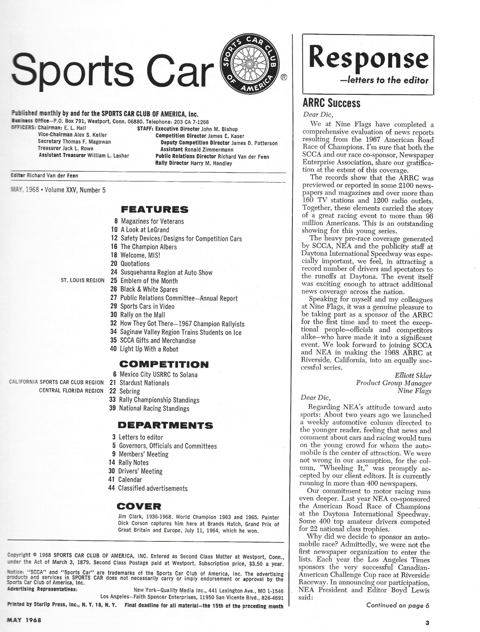 Reviews SPORTS CAR 1968 MAY - LEGRAND, THE CHAMPION ALBERS, MIS, SUSQUEHANNA AUTO SHOW