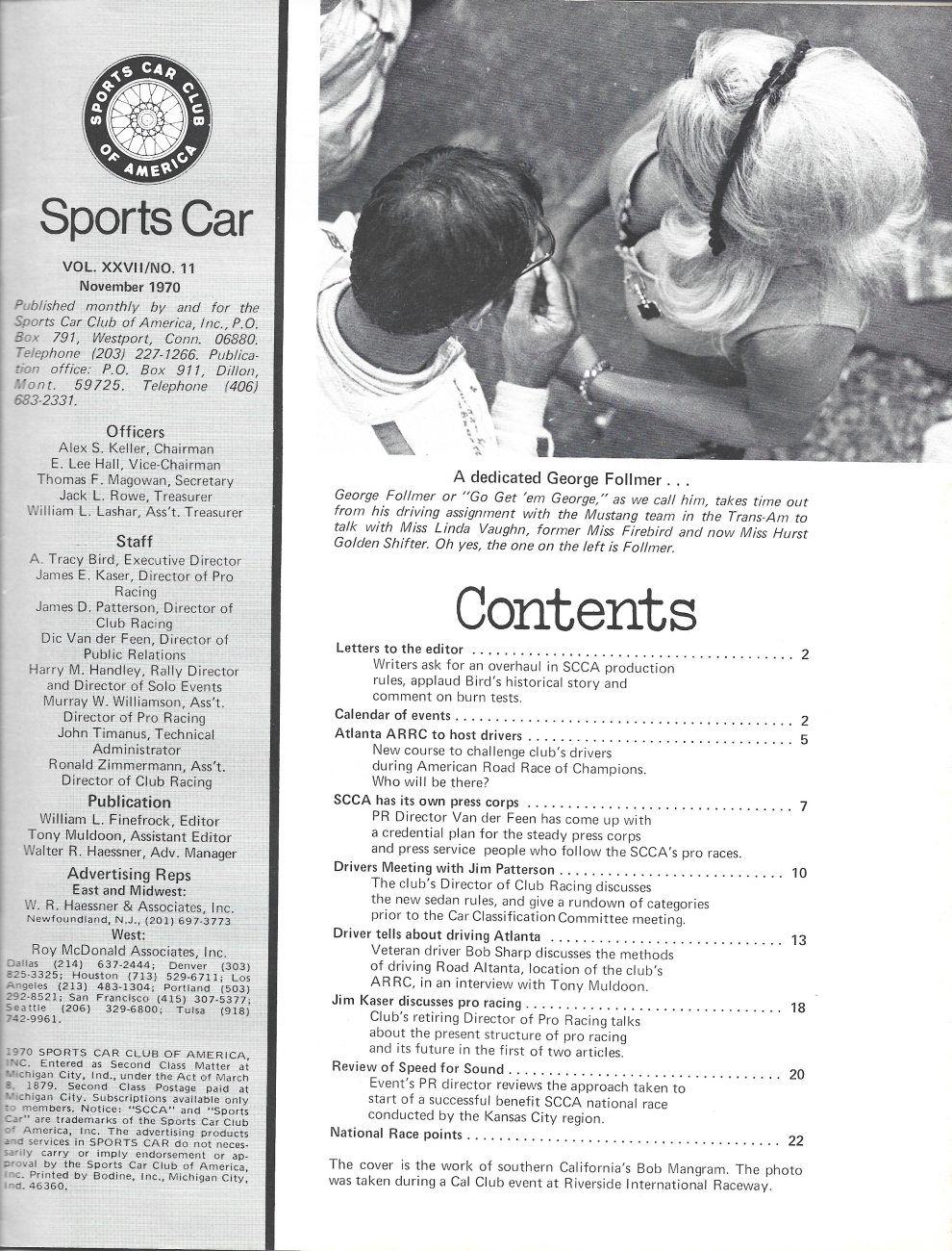 Reviews SPORTS CAR 1970 NOV - GEORGE FOLLMER & LINDA VAUGHN PHOTO, BOB SHARP - ATLANTA